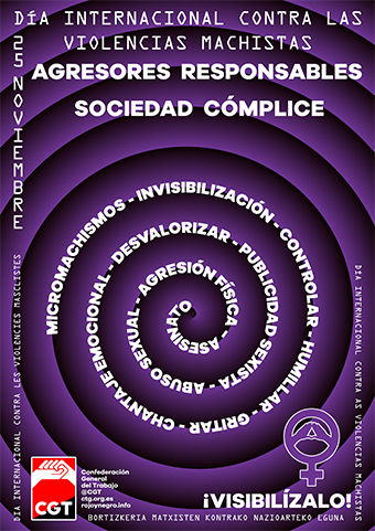 Este 25 de Noviembre, desde CGT queremos denunciar que, a menudo, quienes ostentan el poder y legislan, responsabilizan y culpabilizan a las mujeres del paro estructural existente, de las diferencias salariales, del déficit en el sistema público de pensiones, de la diferencia de derechos, de las violaciones, de los malos tratos... son quienes actúan directa o indirectamente para impedir nuestra emancipación y realización como mujeres libres.