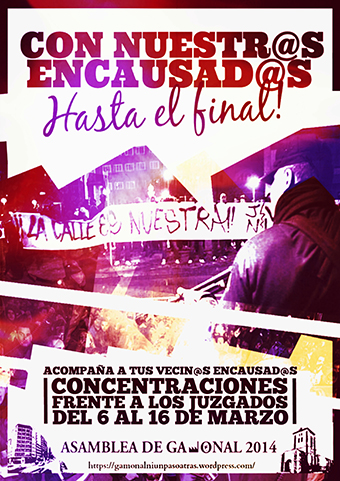 A partir del próximo mes de marzo 12 jóvenes comenzaran a ser juzgados. Estamos obligados a salir de nuevo a la calle, a luchar para impedir que sean condenados, a acompañarles y que sientan nuestro calor y nuestro apoyo. Cualquiera puede verse en su situación, no gires la cara, tu indiferencia es la fuerza del mismo poder que te