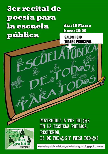 La Plataforma Escuela Pública, Laica y Gratuita de Burgos, de la que forma parte CGT, va a celebrar por tercer año consecutivo el Recital “Poesía y música por la Escuela