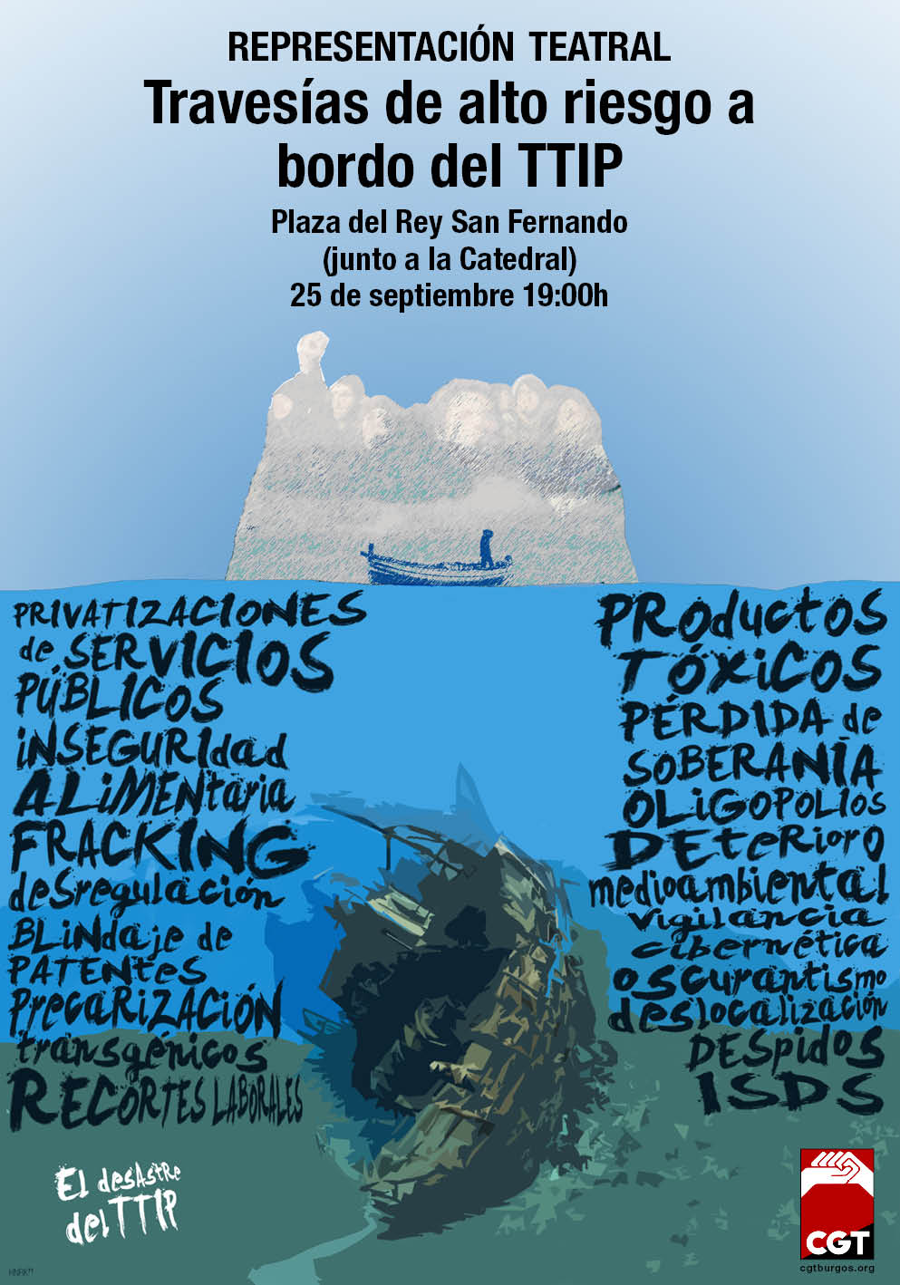 CGT no va a dejar de estar en esta lucha. Continuamos con la campaña de recogida de firmas (ya se han superado los 2,5 millones en toda Europa), y el día 25 como avance ante la Semana Internacional de Lucha de Octubre, realizaremos una representación teatral de la obra Travesías de alto riesgo a bordo del TTIP en el centro de la ciudad. Será en la Plaza del Rey San Fernando (junto a la Catedral) el 25 de septiembre a las 19:00 horas.