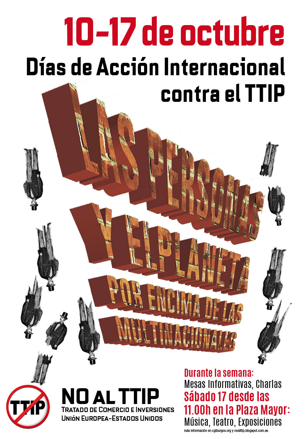 En los últimos dos años en Europa ha crecido enormemente el movimiento contra el TTIP y el CETA. Este 6 de octubre, la Iniciativa Ciudadana Europea contra el TTIP y el CETA celebra su primer año de vida con más de 2,8 millones de firmas. Durante esta semana se celebrarán por todo el mundo actos de lucha. En Burgos instalaremos mesas informativas, realizaremos charlas y culminaremos la semana con una Jornada de Lucha contra el TTIP en la Plaza Mayor, junto con otras organizaciones. Exposiciones, mesas informativas, música y teatro. En América del Norte, América Latina y el Pacífico la gente se está organizando para poner fin al asalto del imperialismo corporativo, que se agrava en gran medida por el Tratado Transpacífico (TPP que está muy cerca de cerrarse impulsado por las grandes multinacionales y jefes de Estado como Barack Obama.